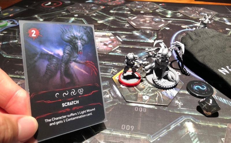 Getting attacked by an Intruder can result in minor or major wounds. Minor wounds don’t directly affect player capabilities, but major wounds can hamper players by reducing the amount of items they can carry. Both can threaten the player with contamination, however, which gums up the player’s action deck with unusable cards and could potentially kill the player at the end of the game. Performing fewer actions and holding onto more action cards when you pass can prevent attacks from surprise encounters, however.