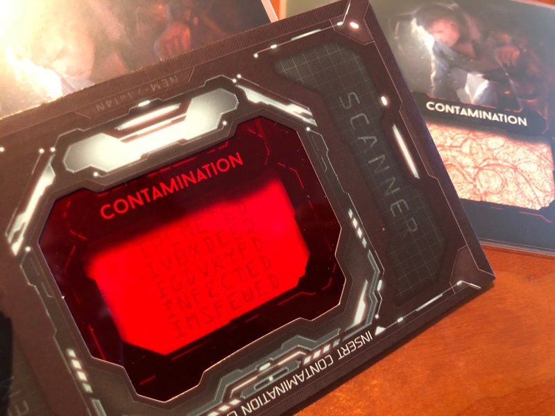The scanned contamination card reveals that the player is infected. If they still have this card at the end of the game, they will die.