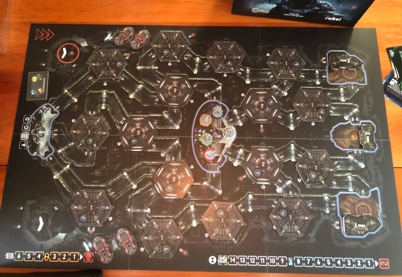 The sound die was rolled when the Soldier player character moved into the Engine Control Room, which triggered the noise die to be rolled. Unfortunately, another sound token was added to corridor 1, which caused both to be removed, and resulted in the player drawing a token and being ambushed by an adult Intruder. They didn’t have enough cards in hand and therefore an attack card was drawn.