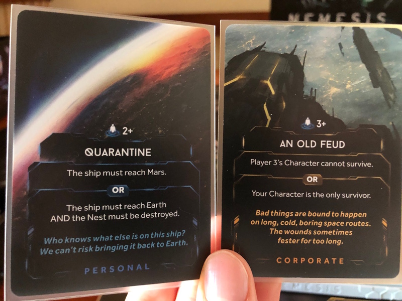 For crew setup, players are assigned a number and receive two secret objective cards: one from the Corporate deck, the other from the Personal deck. The Personal deck objectives tend to be more cooperative, but can still be opposed to one another; for instance, one player may have an objective that the ship must reach Earth, while another player must have the ship reach Mars. The Corporate objective is a lot more combative, with some objectives outright saying a certain player must die!
