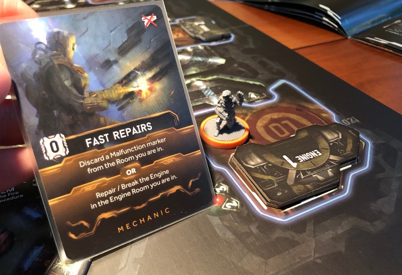 The Mechanic has Fast Repairs, an action card that enables him to either repair a room or easily interact with an engine.