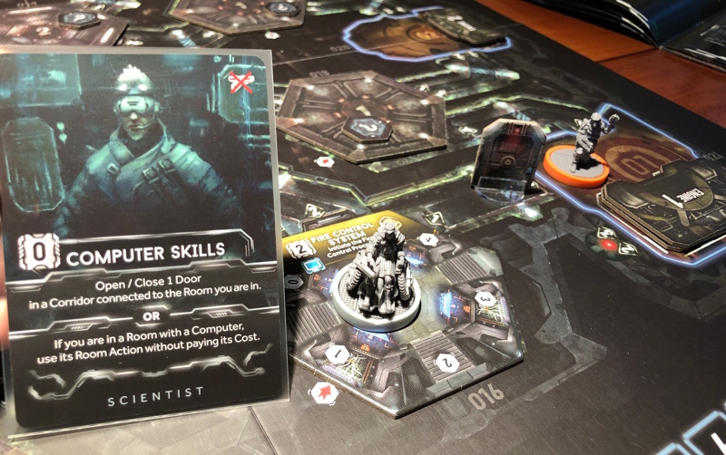 The Scientist, on the other hand, can easily interact with rooms that feature a computer or open/close doors using the Computer Skills action card.