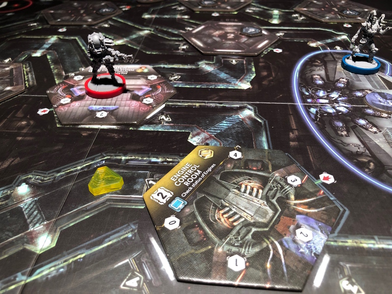 Many rooms also feature room-specific actions that players may perform. For instance, the engine rooms at the back of the ship allow players to either check if one of the three engines are repaired, or though certain action cards, they could choose to “repair” the engine, in which case they can decide to place a working or damaged token on the engine’s position face down (if two of the three engines are damaged at the end of the game, the ship will explode and everyone who stays on it will die!).